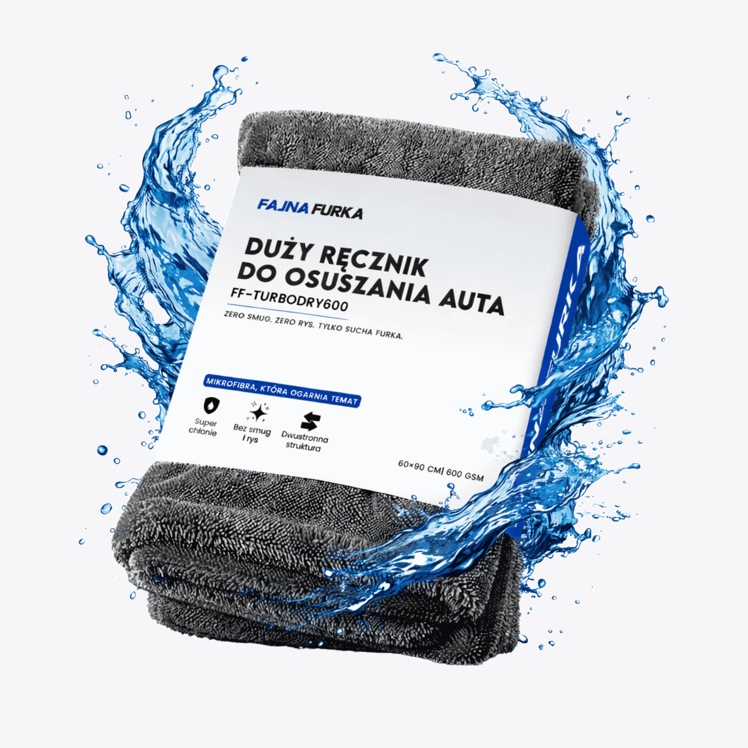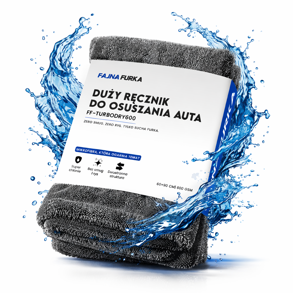 Mycie bez osuszania zostawia zacieki i smugi na lakierze. Ręcznik FAJNA FURKA TURBODRY z gęstej mikrofibry 600 GSM zbiera wodę jednym ruchem, bez wykręcania i bez ryzyka zarysowań. Efekt? Czysty, suchy lakier, bez kombinowania.